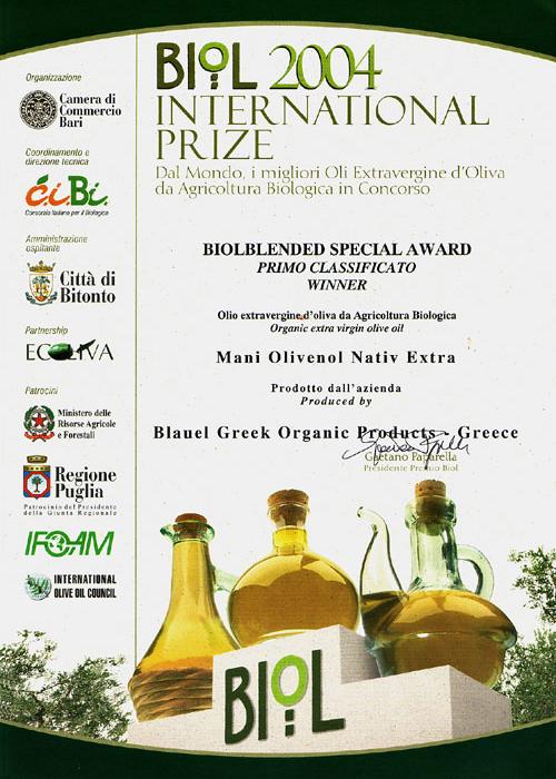 Ένα φανταστικό πρώτο βραβείο απονέμεται από το BIOL στην επιχείρηση Μπλάουελ για το Mani® Olivenöl Nativ Extra βιολογικό εξαιρετικό παρθένο ελαιόλαδο.