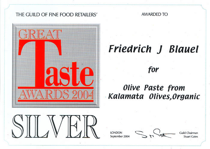 Ακόμα ένα ασημένιο βραβείο γοήτρου απονέμεται από την Guild of Fine Food Retailers στην επιχείρηση Μπλάουελ για το Mani® Organic Olive Paté που προέρχεται από βιολογικές ελιές Καλαμών. |