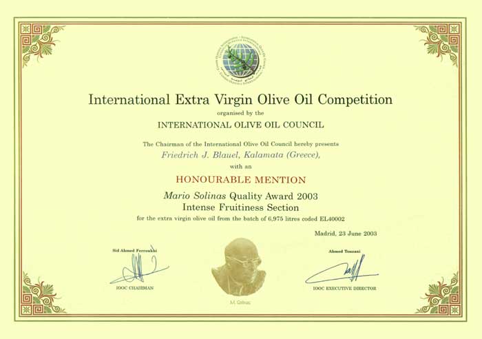 Mια τιμητική αναφορά (η οποία αντιστοιχεί στην 4η θέση του διαγωνισμού) απονέμεται από το Διεθνές Συμβούλιο Ελαιολάδου (ΙΟΟC) στην επιχείρηση Μπλάουελ για το Mani® Extra-Virgin Olive Oil. Eαν υπάρχει ένα επίσημο παγκόσμιο πρωτάθλημα ελαιολάδου, αυτό είναι το Mario Solinas, το οποίο διευθύνεται από το IOOC στην Ισπανία. |