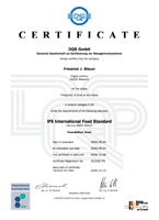 Και ως επιχείρηση και ως παραγωγό των τροφίμων, η Μπλάουελ πιστοποιείται από το DQS Group για: ISO 9001:2000 (πιστοποίηση της διαχείρισης), HACCP (ανάλυση κινδύνου και κρίσιμο σημείο ελέγχου), και IFS (διεθνή πρότυπα τροφίμων). |