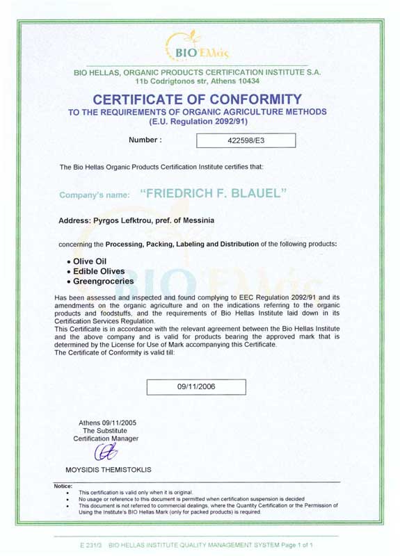 Η Βιο Ελλάς είναι το επίσημο ελληνικό σώμα πιστοποίησης που πραγματοποιεί τις επιθεωρήσεις των προϊόντων Μπλάουελ για τη συμμόρφωση με τον κανονισμό 2092/91 της ΕΕ, ο οποίος καθορίζει τα πρότυπα βιολογικής παραγωγής προϊόντων για την Ευρωπαϊκή Ένωση. Η Βιο Ελλάς αναγνωρίζεται από τις ελληνικές αρχές και από τις αρχές των Βρυξελλών. |
