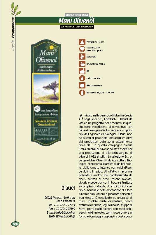 Εκδόθηκε από τον Marco Oreggia, έναν από τους παγκοσμίως πρώτιστους ειδήμονες/ειδικούς δοκιμαστές του εξαιρετικού παρθένου ελαιολάδου, το Mani® Organic Extra-Virgin Olive Oil της επιχείρησης Μπλάουελ, κρίνεται σαν ένα από τα καλύτερα ελαιόλαδα από όλον τον κόσμο στην τελευταία έκδοση που παρουσιάζει 449 ιταλούς παραγωγούς, μαζί με 83 διεθνείς παραγωγούς από 15 διαφορετικές χώρες.