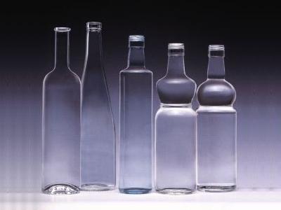 Πράσινες γυάλινες φιάλες, λευκές με κοντό, λοξευμένο λαιμό.