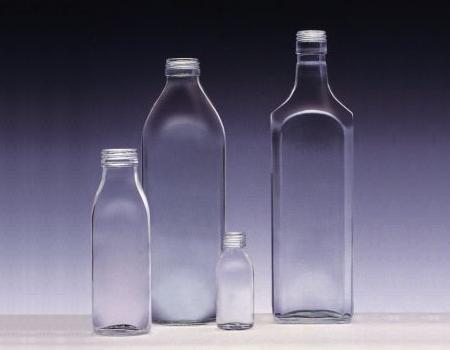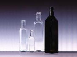 Πράσινες γυάλινες φιάλες, τετραγωνισμένες και λεπτές, με κοντό λαιμό.